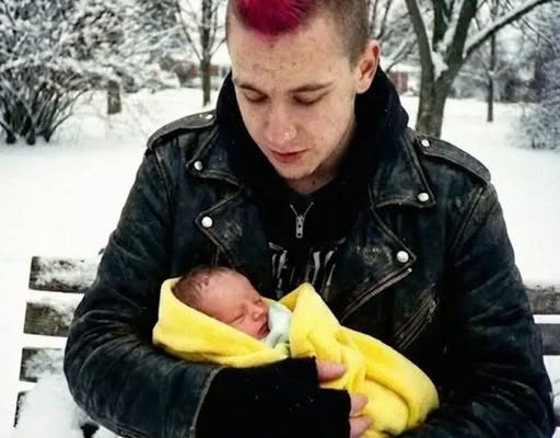 Peering into the park across the street, she saw a flash of pink hair under the orange glow of a streetlight. Jax sat cross-legged on a frozen bench, hunched over a tiny, ragged bundle. Barefoot in the frost, she ran across the street and found her son in an absolute, focused calm. Against his chest lay a newborn, red-faced and shivering, wrapped in only a thin sheet. Jax had already called emergency services and was using his own body heat, shielded by his leather jacket, to keep the infant alive. His lips tinged blue and his body shivering, he refused to move—he was the only thing standing between the child and a quiet death in the snow.