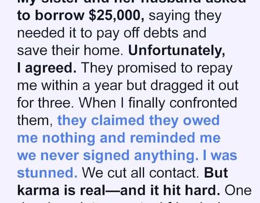 My sister and her husband asked to borrow $25,000, insisting they needed it to pay off debts and save their home. I hesitated—money and family rarely mix—but they sounded desperate. My sister cried, telling me they’d be homeless without help. Against my better judgment, I agreed.