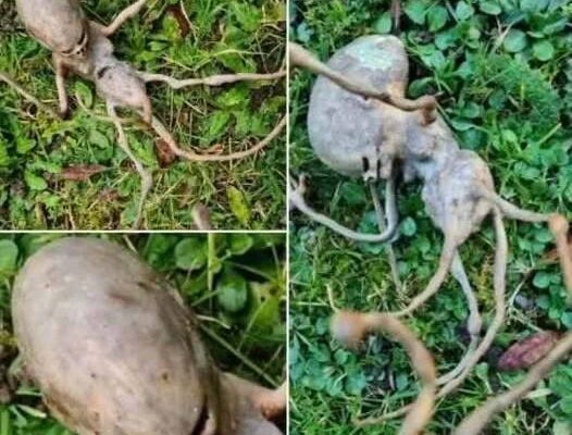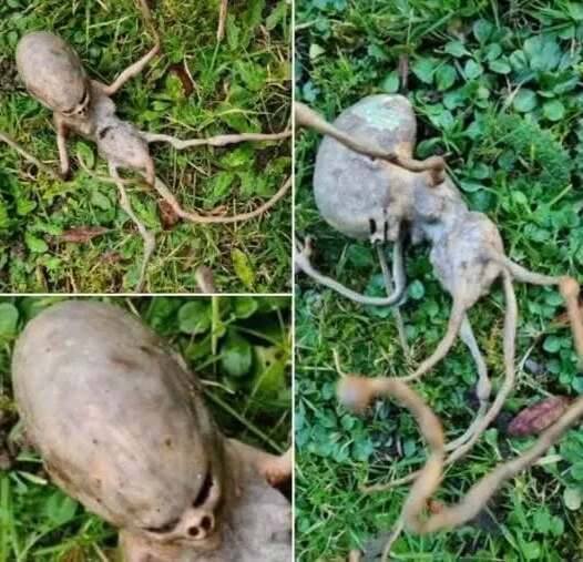 Stepping outside for a routine glance at her garden, the homeowner froze. Before her lay what she described as “downright alien.” It defied the familiar symmetry of plants and the recognizable anatomy of local animals. Its form was grotesque and elongated, resembling a skeletal skull atop a narrow, spindly torso. The appendages—thin, cane-like limbs—jutting out at odd angles where arms and legs might have been, added to the eerie effect. The whole thing was monochrome, desiccated, and seemed to shimmer somewhere between organic and metallic under the morning light.