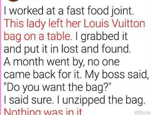 One day, while I was working at a fast food restaurant, this lady left her Louis Vuitton bag on the table.o I grabbed it and placed it in the lost and found.I never glanced inside.A month passed by.My manager asked, “Hey, it’s been a month…