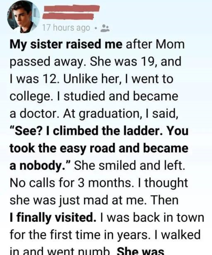My mother passed away when I was twelve, and my nineteen-year-old sister stepped into a role she had no time to prepare for. She left her studies, worked two jobs, and quietly took responsibility for everything that kept our lives moving. She stretched what little we had and carried herself with a calm that made things feel more stable than they actually were. I focused on school, as she wanted me to, and in time I graduated from university. At the ceremony, I noticed her sitting in the back row, clapping—nothing dramatic, just present. When I spoke to her afterward, instead of acknowledging what she had done, I said something careless. I told her she had taken the easy path and ended up with nothing. She didn’t respond with anger. She simply said she was proud of me and stepped away.