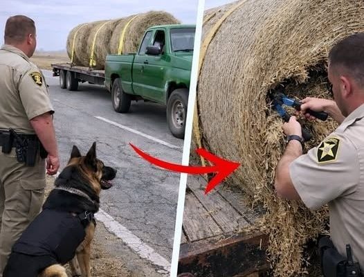 When the cutter sliced through the netting, the illusion finally broke. Instead of loose stalks, Miller’s fingers brushed something cold, smooth, and unmistakably manufactured beneath a thin layer of glued hay. He peeled it back and shined his flashlight into the opening, the beam catching hard edges where none should exist. His breath hitched, his face draining of color as the truth snapped into focus. This wasn’t farm cargo—it was a carefully disguised transport, hidden in plain sight on a public highway. Miller staggered back, signaling for backup as Duke’s barking reached a fever pitch, the reality of what lay inside those bales far worse than he had imagined. Whatever was hidden there wasn’t just illegal—it was dangerous enough to turn an ordinary traffic stop into something that would haunt him long after the road went quiet again.READ MORE BELOW