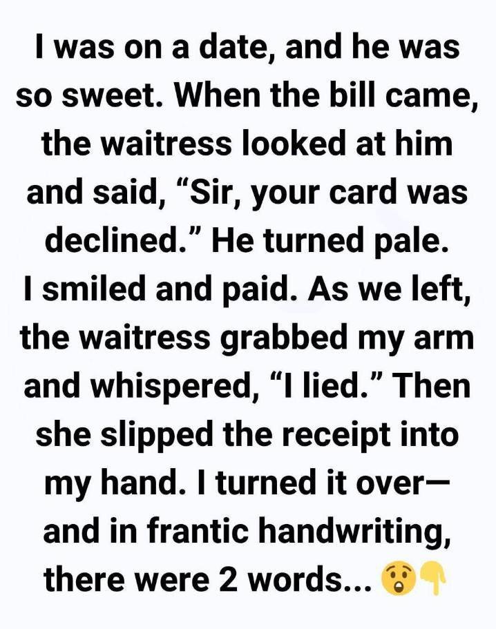 I turned back to see the server, who must have rushed out after us. She was breathing slightly heavily, her cheeks pink from the sudden sprint. She leaned in conspiratorially, her eyes reflecting the streetlights. “Sir,” she whispered, her voice a low, confidential confession. “I lied.”