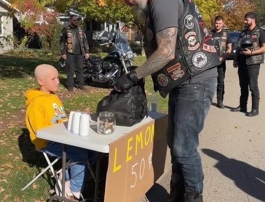 Then the low rumble of motorcycles rolled through the quiet suburb. Four bikers on Harleys approached, leather vests shining in the afternoon sun as nervous neighbors hurried their children inside. For the first time all day, Tyler stood up. The lead biker, a huge man with a gray beard, stopped at the curb and noticed a small handwritten note taped beneath Tyler’s “50 cents” sign. After kneeling to read it, his intimidating expression melted into tears. The note explained that Tyler wasn’t selling lemonade at all—he was trying to raise money for his own funeral because his mother didn’t know he knew she couldn’t afford it.