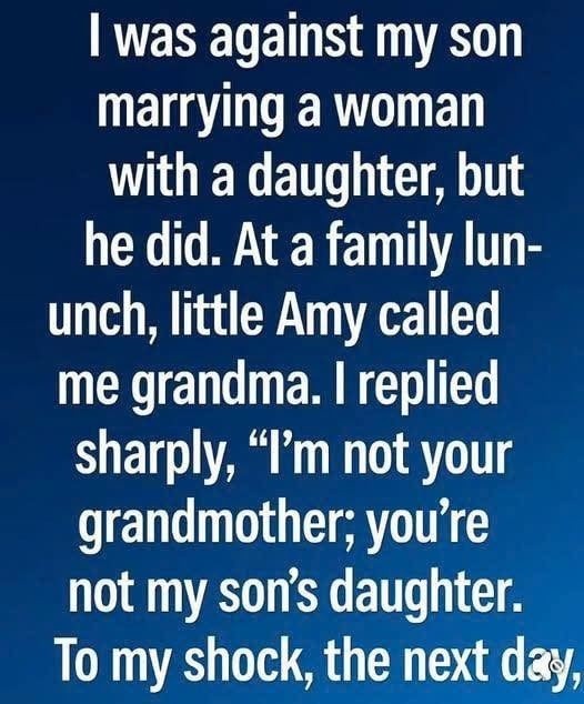 I was against my son marrying a woman with a daughter, but he did. At a family lunch, little Amy called me grandma. I replied sharply, “I’m not your grandmother; you’re not my son’s daughter.” To my shock, the next day, my son arrived at my door with a look I had never seen on him before — disappointment mixed with quiet hurt. He asked me why I would speak that way to a child who had done nothing but try to love me, and his words settled heavily on my heart.