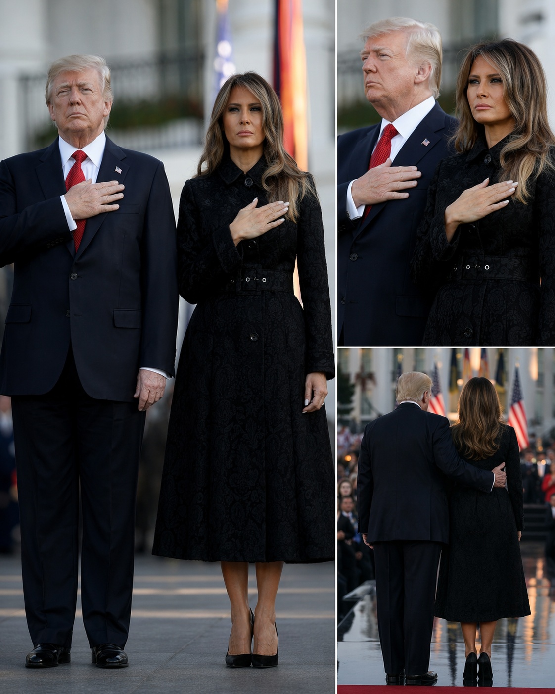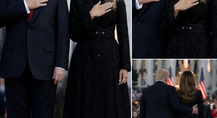 Melania stood beside him, slightly behind, her posture calm and composed.